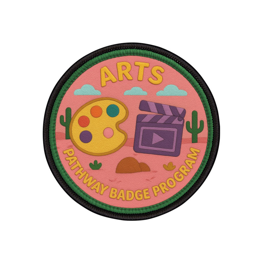 The Arts Badge (Foundations K–2) celebrates a child’s first steps in creativity, imagination, and self-expression. Designed in the Pink Desert theme, this embroidered badge features a painter’s palette and film strip set against pastel sands with turquoise skies and cactus silhouettes, representing storytelling, creative expression, and discovery.